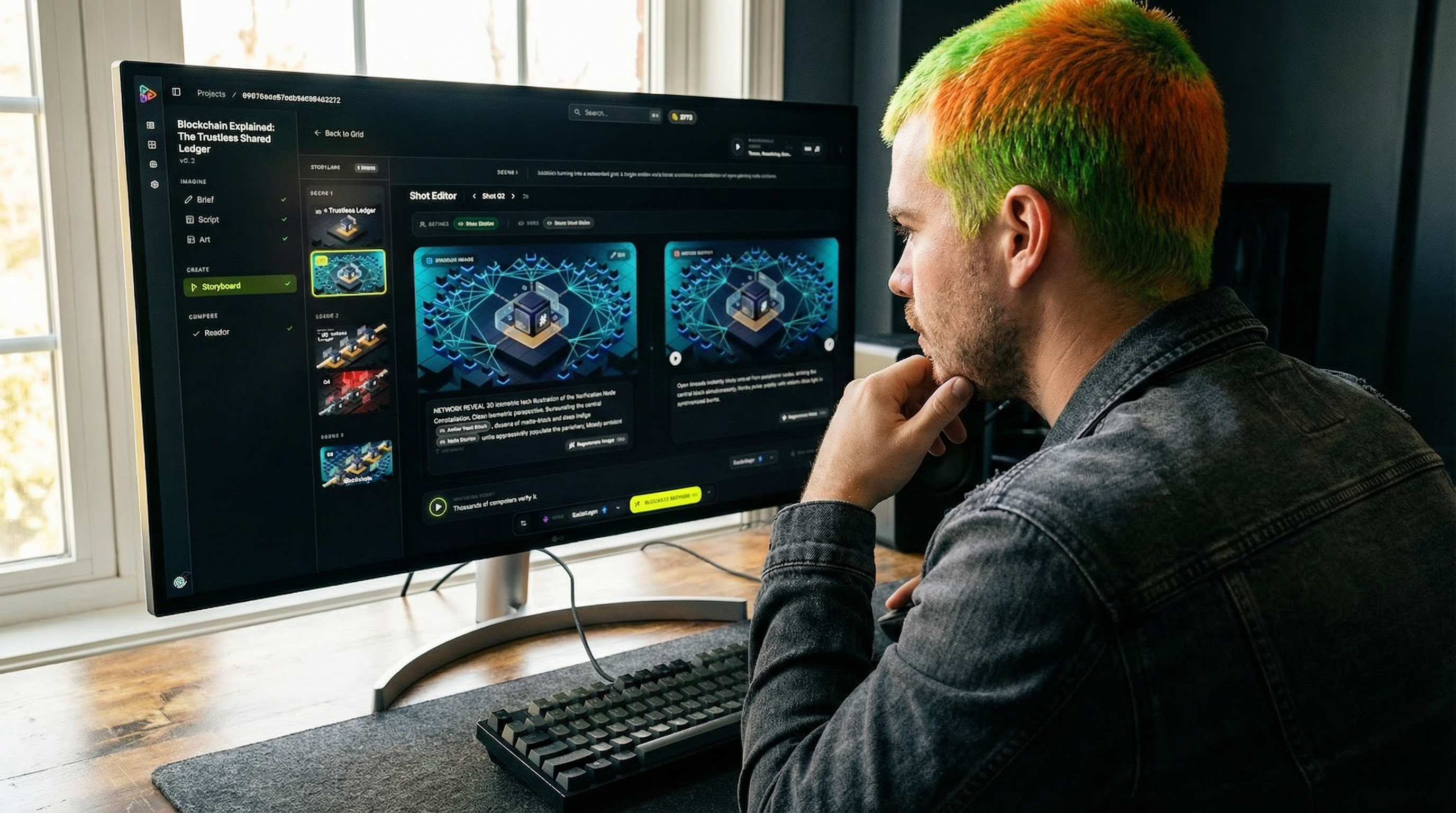 Tool-hopping between ChatGPT, Midjourney, Runway, and Premiere. A fragmented nightmare of subscriptions and rendering.