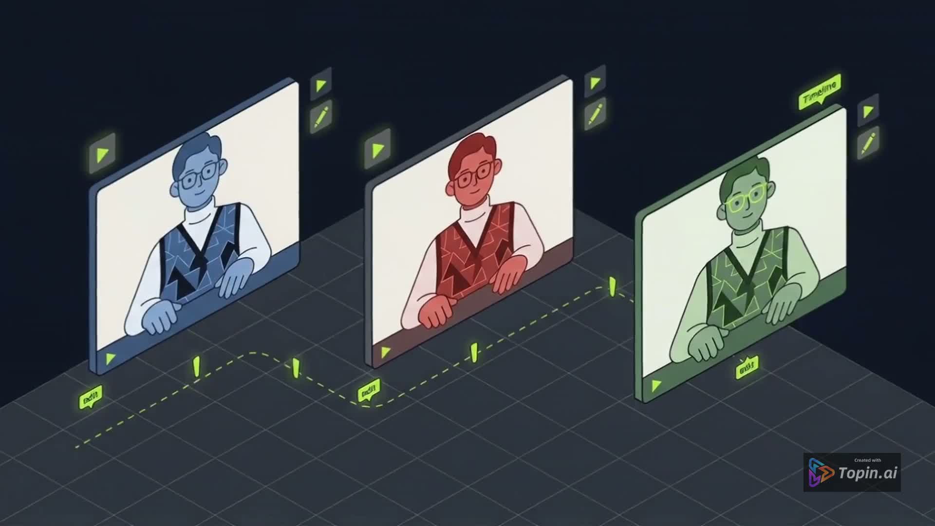 Most AI video generators act like slot machines—tweak the prompt, and the entire scene mutates. In Topin you can edit any shot's visual prompt, motion, or voiceover individually. Re-roll one frame without touching the rest of the project.